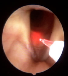 Removal of papillomas usually takes place under general anesthesia in an operating room. Once the patient is fully asleep, a special scope holds open the mouth until the throat can be seen under a microscope (see photograph below). The involved areas should be carefully inspected and mapped out. A biopsy is generally taken, especially if an area looks suspicious. A combination of lasers, micro-instruments and injections are used to treat the involved areas. In advanced centers, the ideal laser to treat papillomas is the KTP LASER. This opinion is supported by dozens of published articles in the medical journals. The photograph shows an area of papillomas being treated with the KTP laser.